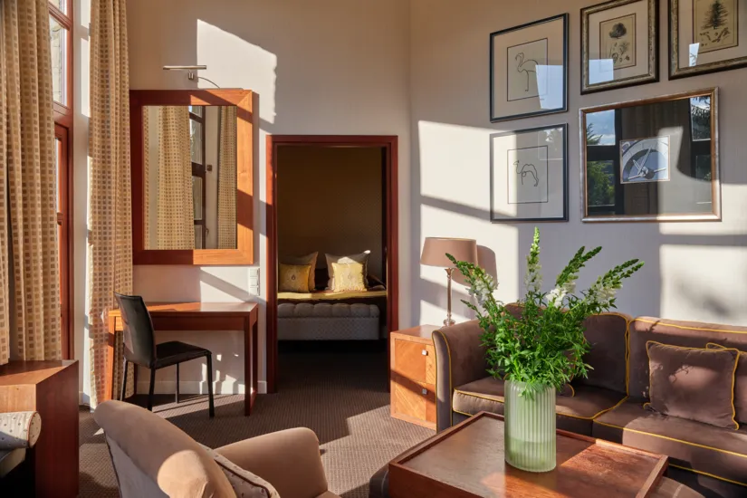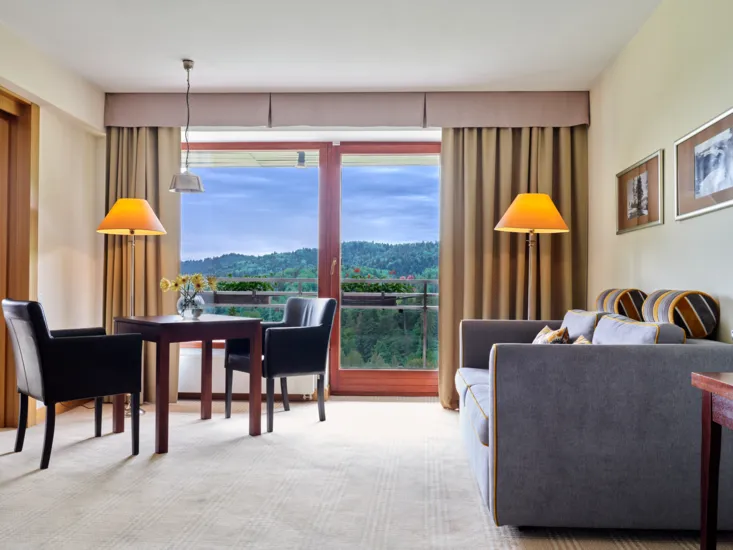 Przestronny i komfortowy pokój z salonem i sypialnią. W sypialni łoże małżeńskie, w salonie dodatkowo rozkładana sofa.