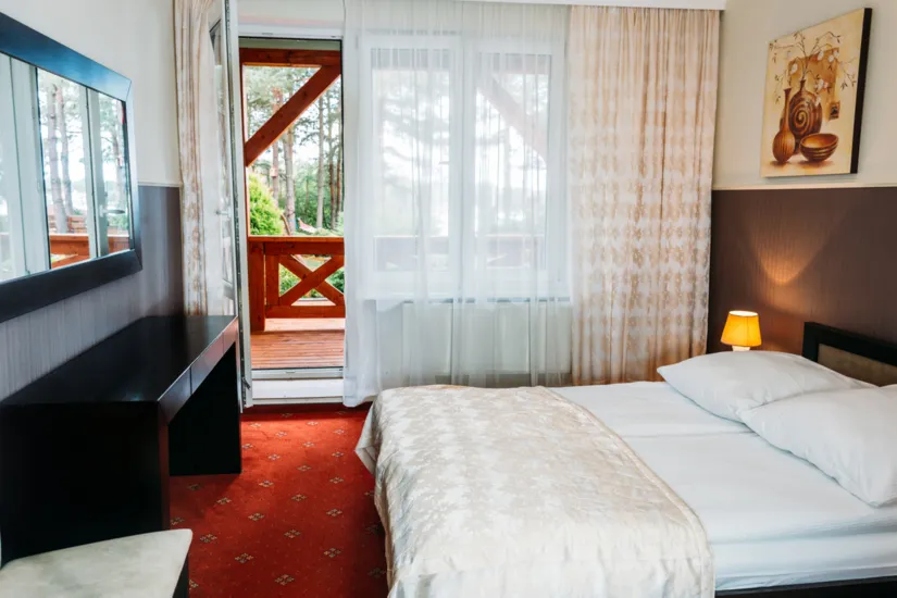 POKOJE HOTELOWE: 100 miejsc noclegowych 45 pokoi ( 34 pokoi z balkonem i widokiem na jezioro Tajty ) Studio, Możliwość dostawki, Wyposażenie pokoi: łoża małżeńskie, łózka 1os. , telefon, TV Sat, pełen węzeł sanitarny.