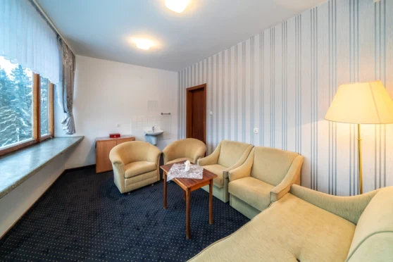 Lokalizacja: Hotel usytuowaniu na północnym skraju Polany Zgorzelisko, na szczycie zalesionego grzbietu górskiego Wierch Poroniec o wysokości 1105 m n.p.m, 18 km do centrum Zakopanego, tuż obok Stacji Narciarskiej Małe Ciche. Hotel znajduje się na trasie do Morskiego Oka, w pobliżu atrakcyjne dwie trasy rowerowe.