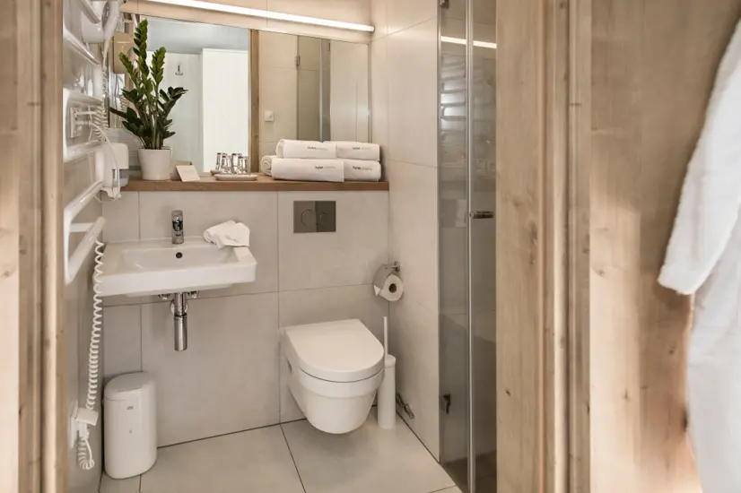 Pokoje: Do dyspozycji naszych Gości oddajemy 37 pokoi, mogących pomieścić maksymalnie 79 Gości w pokoajch 2 i 3 osobowych. Mamy 32 pokoje typu standard 1 lub 2 osobowe, 4 pokoje superior 1, 2 lub 3 osobowe oraz 1 pokój delux 1, 2 lub 3 osobowy (łożka możemy rozdzielić). W każdym z pokoi znajduje się łazienka z prysznicem.