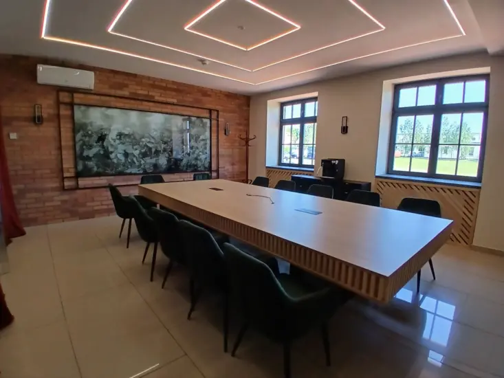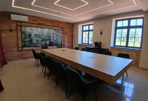 Sala Krzyżacka – Refektarz – elegancka, klimatyzowana przestrzeń o zabytkowym charakterze, idealna na spotkania biznesowe, szkolenia czy kameralne bankiety. Wyposażona w nowoczesne systemy AV i dostęp do światła dziennego.