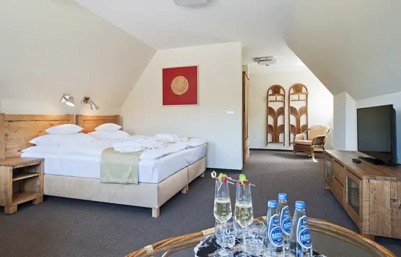 Pokoje: Około 50 miejsc noclegowych w 24 pokojach hotelowych; 6 apartamentów w pensjonacie znajdującym się 50 metrów od hotelu.