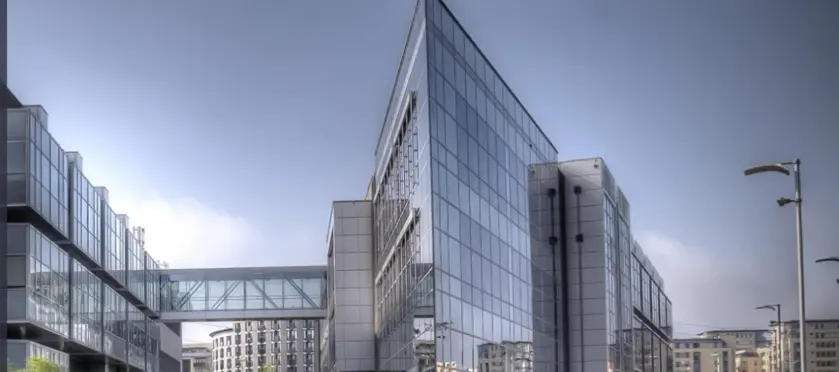 Architektura: kompleks 3 nowoczesnych, przeszklonych budynków.