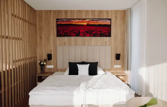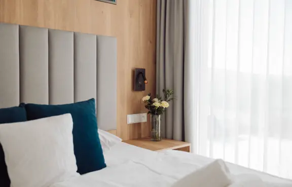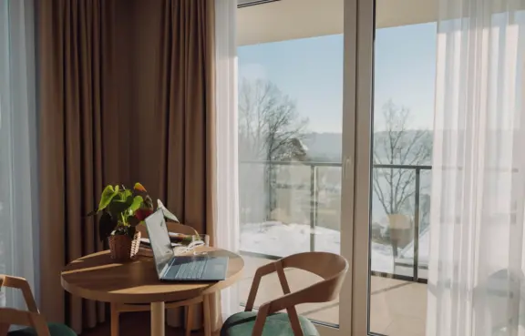 Baza noclegowa: obiekt dysponuje 49 komfortowymi pokojami oraz apartamentami o zróżnicowanym standardzie. Nowoczesne wnętrza oraz duże przeszklenia zapewniają gościom piękne widoki na okoliczną przyrodę i komfortowy wypoczynek po intensywnym dniu spotkań biznesowych.