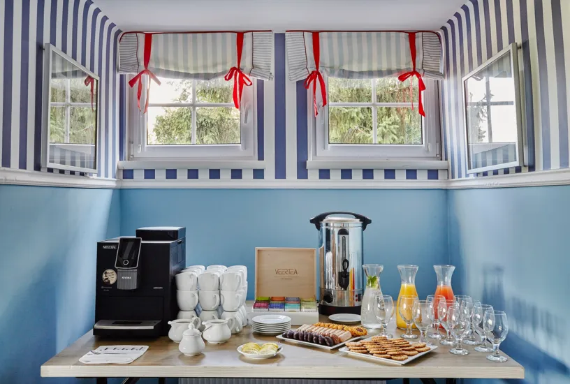 Sala Oficerska to wyjątkowa kameralna sala zlokalizowana na I piętrze. Wyróżnia ją panoramiczny widok na Jezioro Zegrzyńskie. Przestrzeń idealna na firmowe spotkania w wąskim gronie pracowników lub kontrahentów.