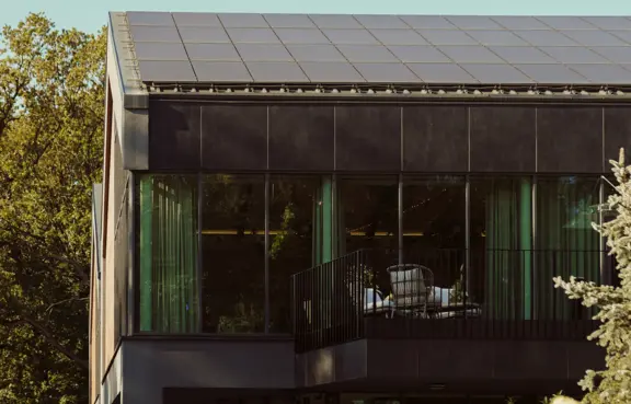 Architektura: wysoki budynek w stylu nowoczesnej stodoły ze spadzistym dachem i przeszkleniami.