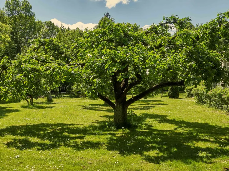 Budynek w typie dworku porośnięty zielonym bluszczem.