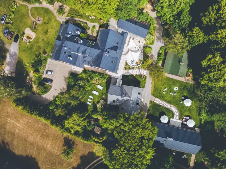 W obiekcie znajduje się pięć budynków, spójnych architektonicznie, wykonanych wyłącznie z naturalnych materiałów - drewna, kamienia, gliny. Jasne elewacje otacza zieleń i kwiaty, parking dolny i górny. Wokół obiektu , przez bezkresne pola, łąki i malownicze wąwozy, biegną trasy spacerowe.