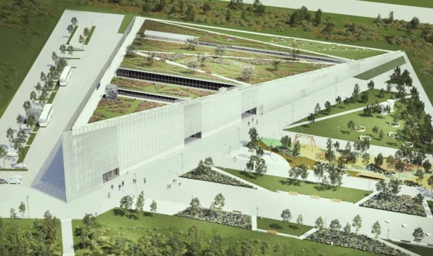Architektura: nowoczesny, przeszklony i interaktywny kompleks w kształcie ostrosłupa trójkątnego. Obiekt złożony jest z 4 brył połączonych elewacją.