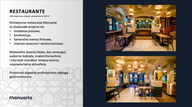 RESTAURANTE 100 miejsc przy stołach, powierzchnia 200 m2 Niebanalny wystrój lokalu, bar serwujący wyborne koktajle, znakomita kuchnia i latynoski charakter miejsca tworzą niepowtarzalną atmosferę.