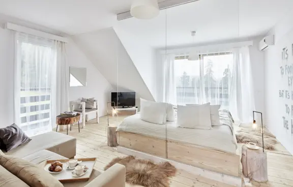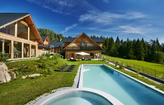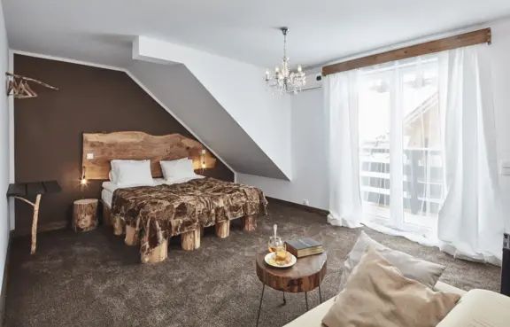 Pokoje: Komfortowe pokoje i apartamenty urządzone są nowocześnie, nawiązując jednocześnie do tradycyjnego stylu podhalańskiego. Apartamenty prezydenckie znajdują się w dwóch osobnych, piętrowych willach.