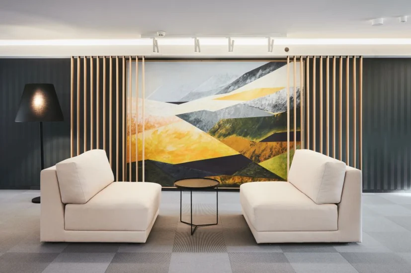 Architektura: Kilkubryłowy, murowany budynek z białą elewacją i płaskim dachem, z nowoczesnymi wnętrzami.