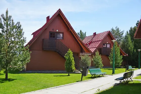 Architektura: na obiekt składa się 9 domków drewnianych, otoczonych zielenią.