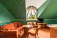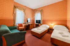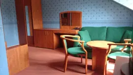Wyposażenie pokoju: dwa pojedyncze łóżka, szafki nocne, szafa ubraniowa, stolik, krzesła, telewizor, lodówka, czajnik elektryczny, szklanki.