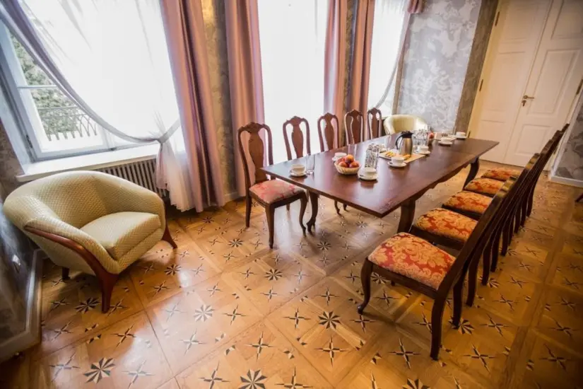 Sale konferencyjne: w Pałacu wynająć można salę balową na 60 gości, salę kolumnową mieszczącą 25 osób, salon niebieski, salę stiukową oraz sale dyskusyjne dla 12 i 16 osób.