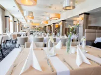 Restauracja Atmosfera z 350 miejscami na bankiet na tej samej kondygnacji co sale konferencyjne. Oferujemy elastyczną ofertę gastronomiczną.