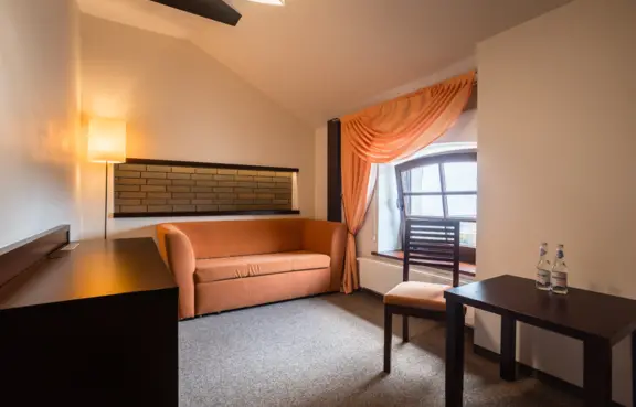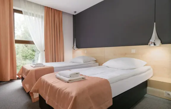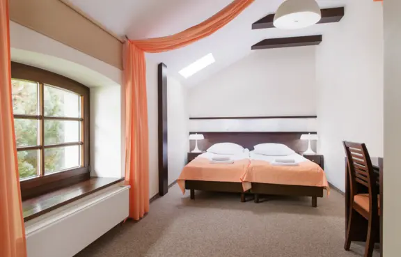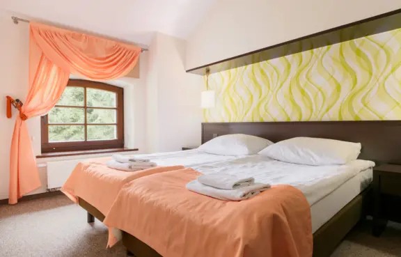 Pokoje: Na zaplecze noclegowe obiektu składa się 20 dwuosobowych pokoi z łazienkami (2 z nich przystosowane są do potrzeb osób niepełnosprawnych), 4 dwupokojowe apartamenty, jednopiętrowy domek myśliwski oraz białe domki czyli całoroczne, klimatyzowane domki noclegowe z tarasami. Łącznie na nocleg hotel przyjąć może około 70 osób.