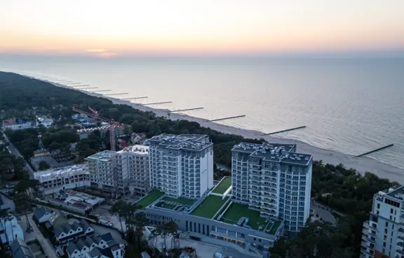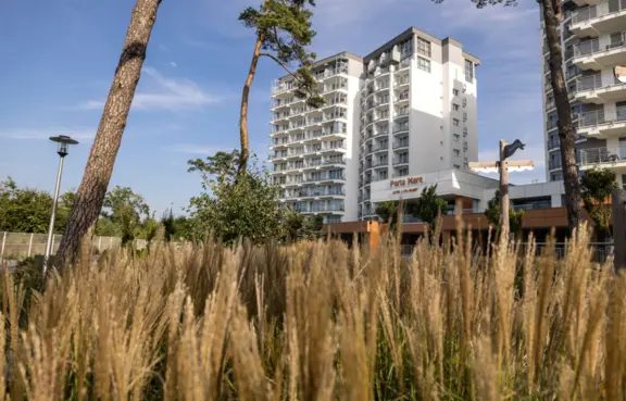 Architektura: obiekt składa się z 2 potrójnych kilkunastopiętrowych nowoczesnych budynków o jasnej elewacji, z balkonami. Resort powstał po przebudowie i modernizacji dawnego ośrodka Róża Wiatrów.