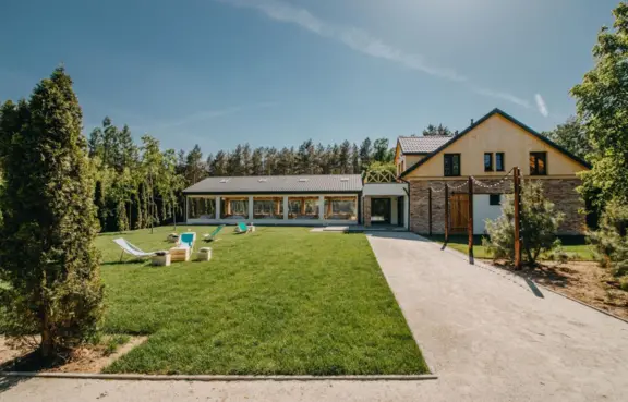 Architektura: piętrowy nowoczesny budynek z więźbą dachową i oranżerią, otoczony jest zielenią.