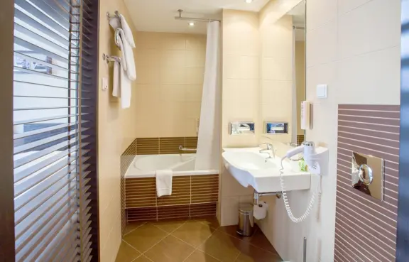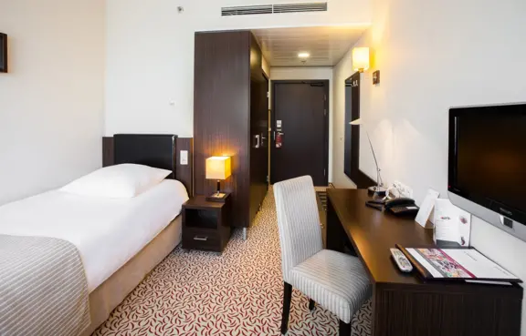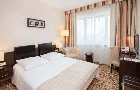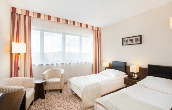Trzygwiazdkowy hotel, ze 125 miejscami noclegowymi, 2 salami konferencyjnymi i restauracją.