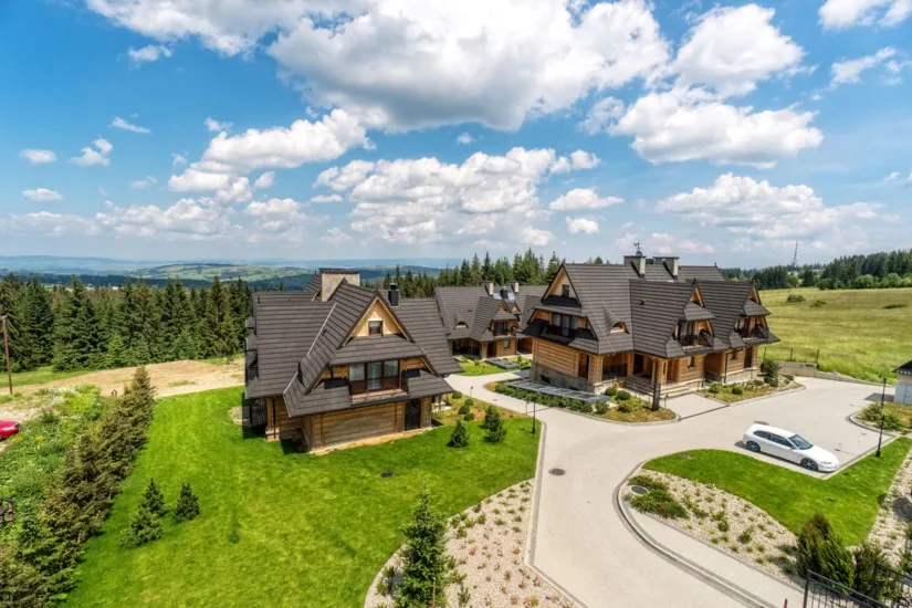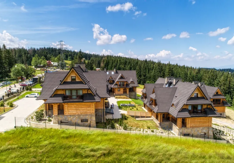 Architektura: Nowoczesny design inspirowany góralskim stylem, który składa się z 4 budynków o tradycyjnej góralskiej zabudowie.