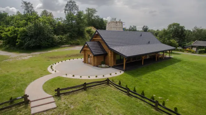 Architektura: parterowy drewniany budynek ze spadzistym dachem i przestronnym tarasem.