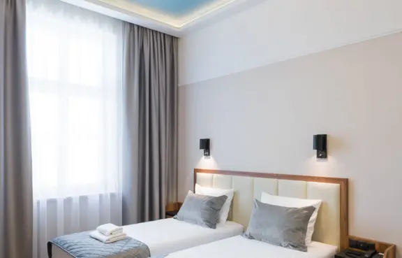 Pokoje: obiekt oferuje 60 pokoi 1- i 2-osobowych. W kolejnej fazie budowy obiekt powiększy się o drugą część hotelu z 71 pokojami i parkingiem podziemnym.