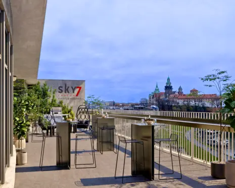 Bezpośredni dostęp 400-metrowego tarasu umożliwia korzystanie z malowniczego widoku na Wawel i panoramę całego Krakowa.