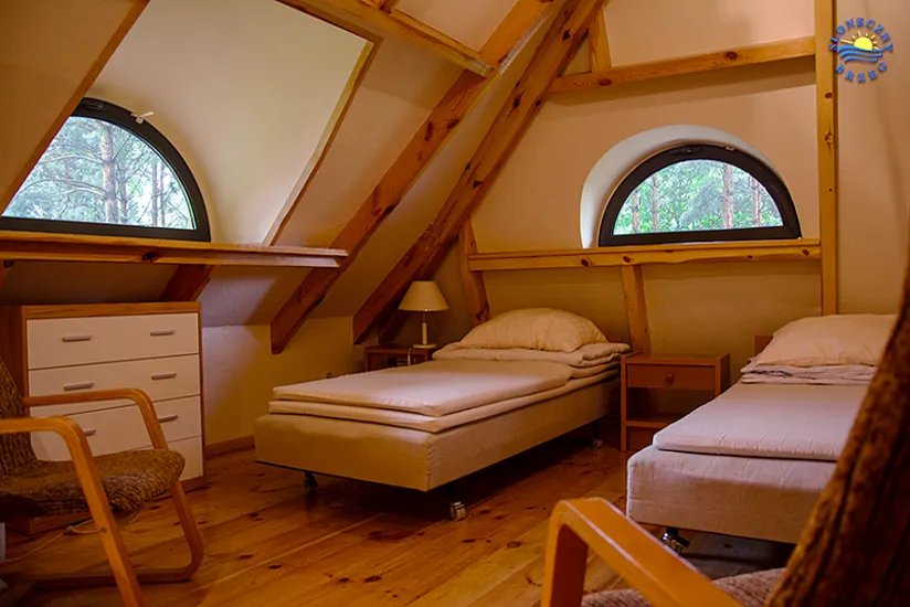 Pokoje: Baza noclegowa składa się z 10 pokoi dwuosobowych, 2 apartamentów, 12 domków typu „brda” o podwyższonym standardzie, chaty dużej z 6 apartamentami i małej chaty z 3 apartamentami – łącznie 130 miejsc noclegowych.