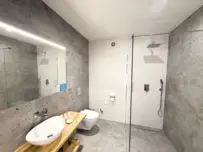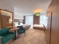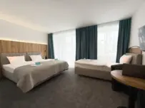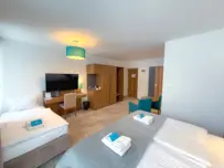 Komfortowy pokój trzyosobowy z balkonem. Wyposażony w wygodne łóżka, dużą szafę, biurko, telewizor z smart TV, lodówkę, zestaw do parzenia kawy i herbaty, sejf oraz łazienkę z prysznicem.