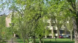 Architektura: Piętrowy budynek o jasnej elewacji.