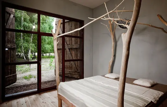 Architektura: minimalistyczny budynek o drewnianej konstrukcji, pokrytej płytami z paliwęglanu. Ściany boczne budynku są przesuwane, otwierając budynek na przyrodę.