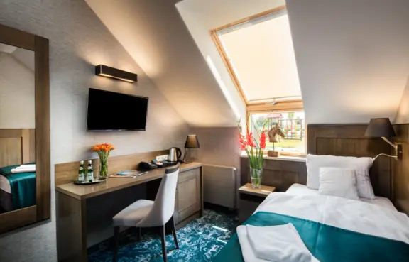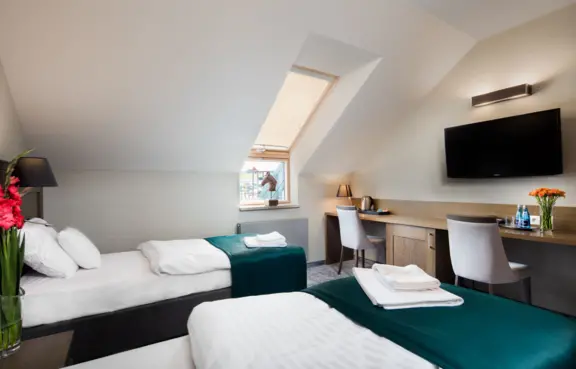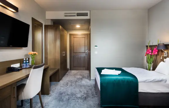 Każdy pokój jest klimatyzowany. Temperaturę w pokoju można ustawić samodzielnie tak, aby była najbardziej odpowiednia dla Państwa. Do pokoju przynależy przestronna łazienka z prysznicem. Przyszykowaliśmy w niej dla Państwa zestaw ręczników, kosmetyki oraz suszarkę do włosów. W pokoju znajduje się biurko do pracy oraz wygodne łóżko. Pokoje wyposażyliśmy w nowoczesne, płaskie 39'calowe telewizory LED. W pokoju czeka na Państwa zestaw powitalny: kawa, herbata oraz woda mineralna oraz dostępna jest sieć Wi-Fi.