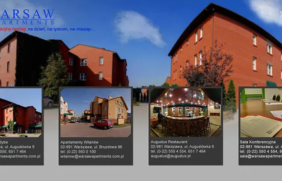 Pokoje: Obiekt oferuje 240 miejsc noclegowych w apartamentach przy ul. Augustówka 9 na Sadybie oraz na Wilanowie przy ul. Bruzdowej 96.