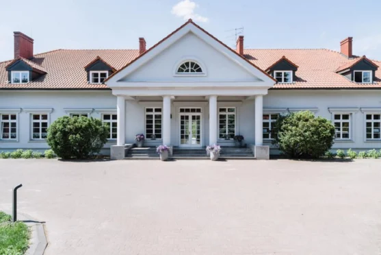 Rezydencja wyglądem nawiązująca do murowanego dworku z czerwonym dachem.