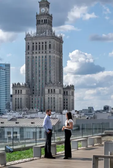 Przestronny taras z imponującym widokiem na panoramę Warszawy – idealny na przerwy kawowe, networking czy relaks na świeżym powietrzu.
